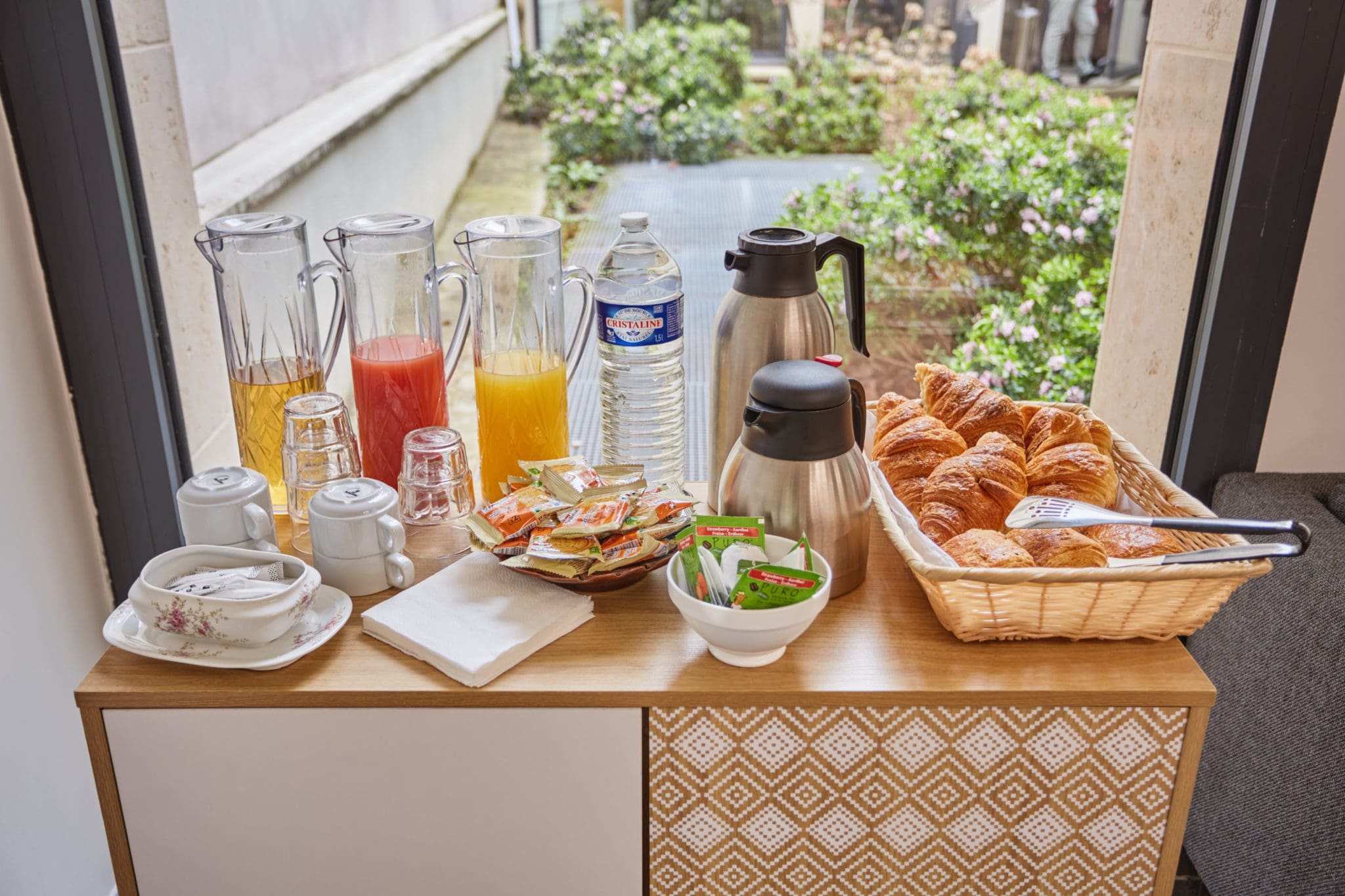 Café d’accueil le matin — café, thé, jus d’orange, eau et viennoiseries.