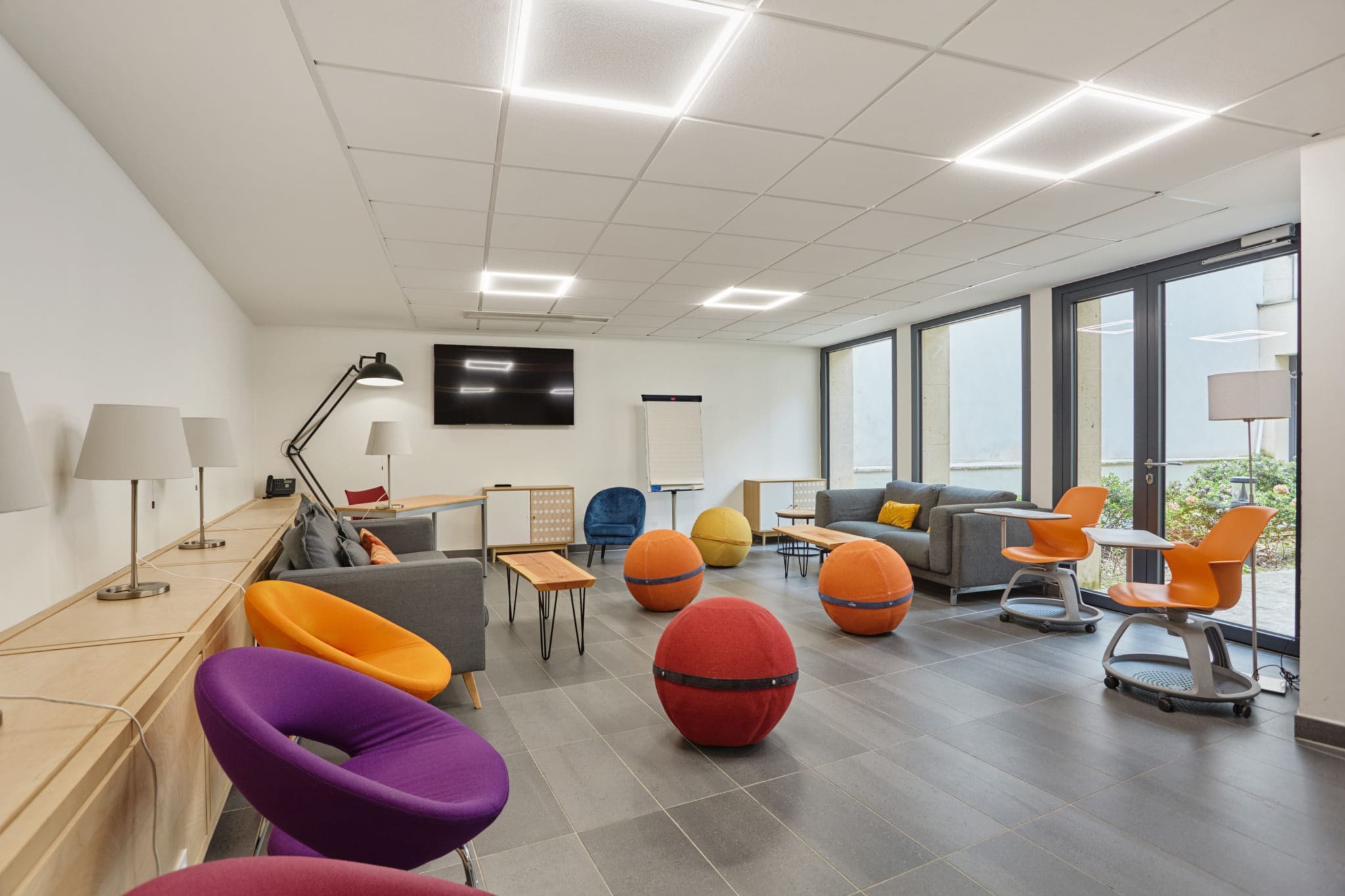 Chaises, ballons de bureau et canapés pour favoriser l’inspiration, le brainstorming et les échanges informels.